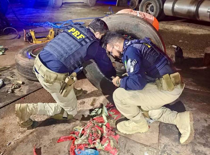 Diante das circunstâncias suspeitas, o caminhão foi conduzido a uma borracharia da região para uma verificação mais detalhada. Após a desmontagem das quatro rodas do eixo traseiro, os policiais encontraram diversos tabletes de drogas escondidos no interior dos pneus.