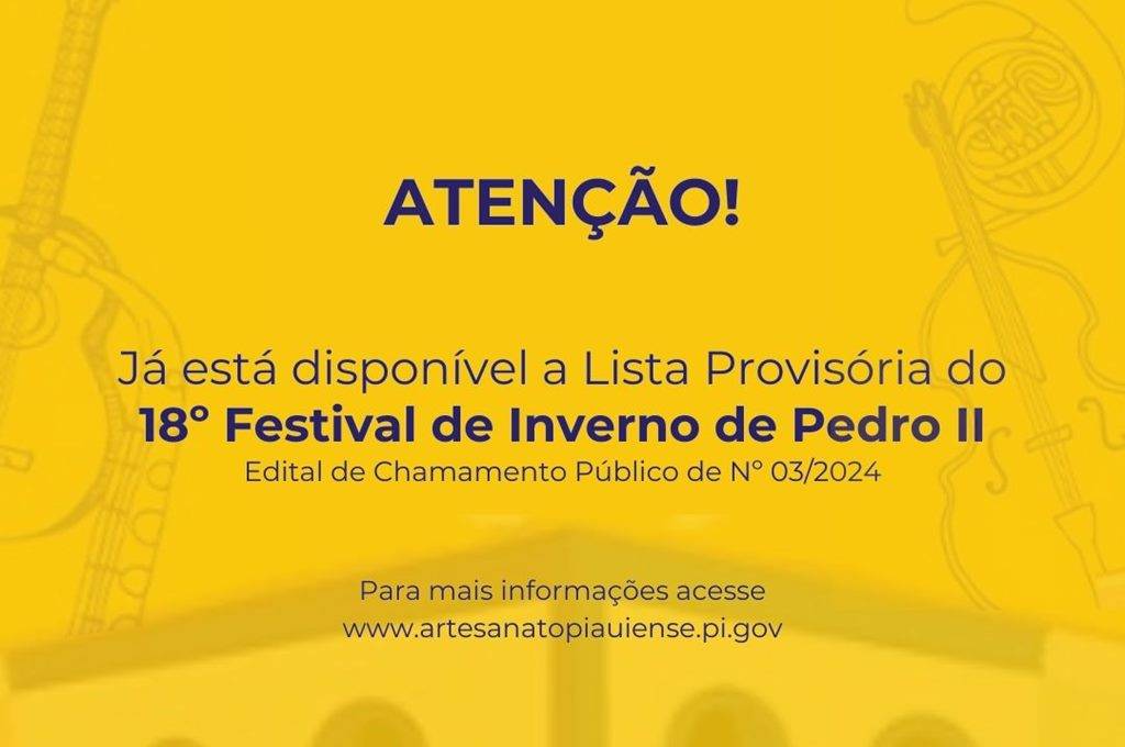 Os interessados devem encaminhar a solicitação do recurso no dia 22 de maioA Secretaria da Cultura (Secult), por meio da Superintendência de Desenvolvimento do Artesanato Piauiense (Sudarpi), divulgou a lista provisória dos artesãos selecionados para o 18º Festival de Inverno de Pedro II, que será realizado de 30 de maio a 2 de junho, na Praça Domingos Mourão, centro histórico de Pedro II.