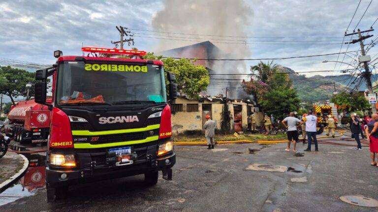 O fogo atingiu uma casa de três andares durante a madrugada, e o morador, um idoso, tentou voltar ao imóvel em chamas para salvar seus pertences. Ele foi impedido pelos bombeiros, mas a grande quantidade de objetos acumulados alimentou o incêndio e dificultou o trabalho de contenção.