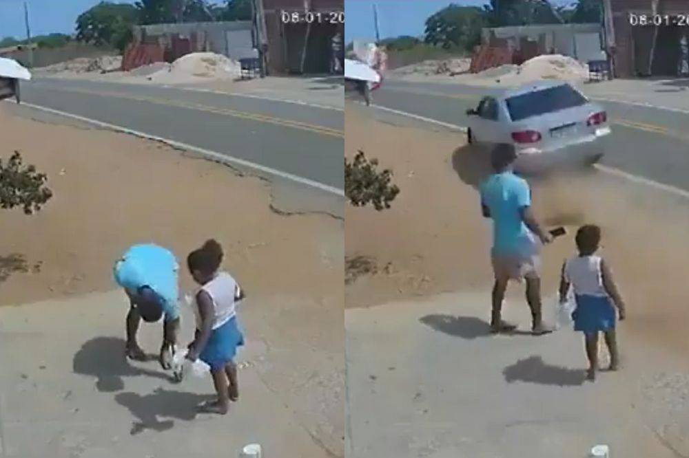 O pai parou para mostrá-la à filha e se abaixou para pegá-la. Nesse instante, um carro em alta velocidade passou a poucos metros deles, invadindo parte da calçada e cruzando a via desgovernado. O veículo só parou após colidir com um monte de areia e capotar.