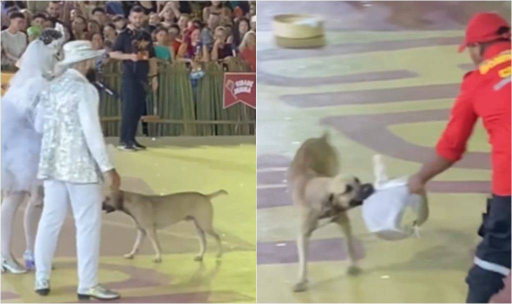 Momentos após invadir o local, o cachorro pega uma sacola com roupas que estava na apresentação
