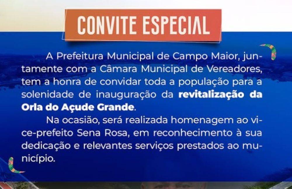 Evento reforça ações de lazer, turismo e convivência para a comunidade de Campo MaiorA Prefeitura Municipal de Campo Maior, em parceria com a Câmara Municipal de Vereadores, convida a população para a solenidade de inauguração da revitalização da Orla do Açude Grande, marcada para o próximo sábado, 16 de agosto.