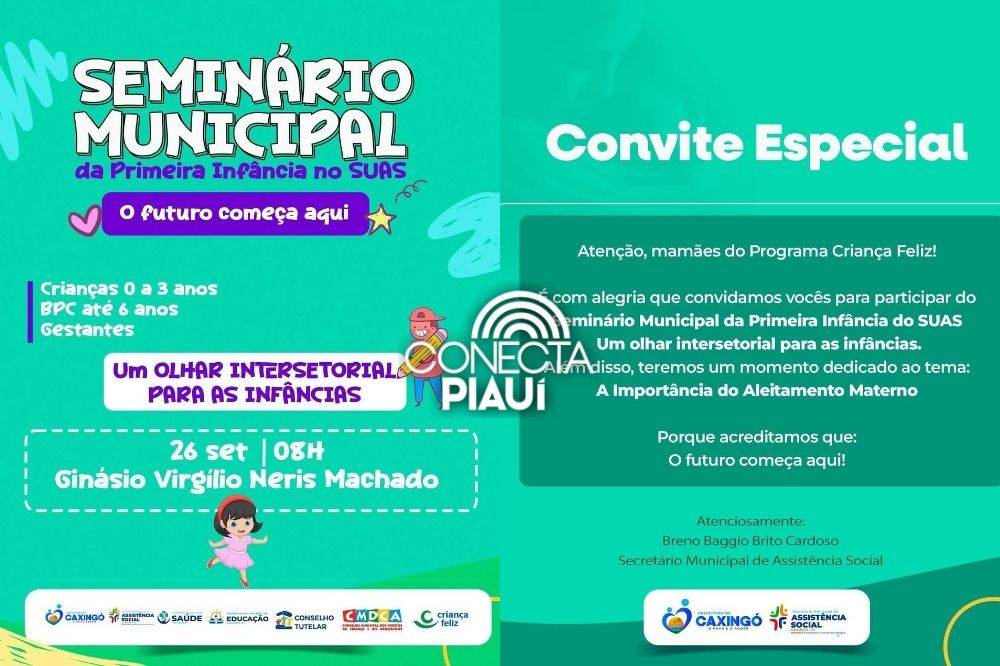 Evento vai reunir gestantes e famílias para discutir aleitamento materno e políticas para a infânciaA Prefeitura de Caxingó, por meio da Secretaria Municipal de Assistência Social, realiza no dia 26 de setembro o Seminário Municipal da Primeira Infância no SUAS, com o tema Um olhar intersetorial para as infâncias. O encontro será no Ginásio Virgílio Neris Machado, a partir das 8h.