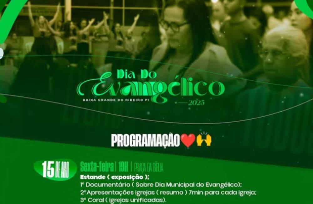 Eventos na Praça da Bíblia e no Centro de Eventos unem fé, esporte e cultura localA cidade de Baixa Grande do Ribeiro se prepara para uma série de eventos em comemoração ao Dia Municipal do Evangélico, que acontecerão na Praça da Bíblia e no Centro Municipal de Eventos, reunindo a comunidade em momentos de fé, esporte e cultura.