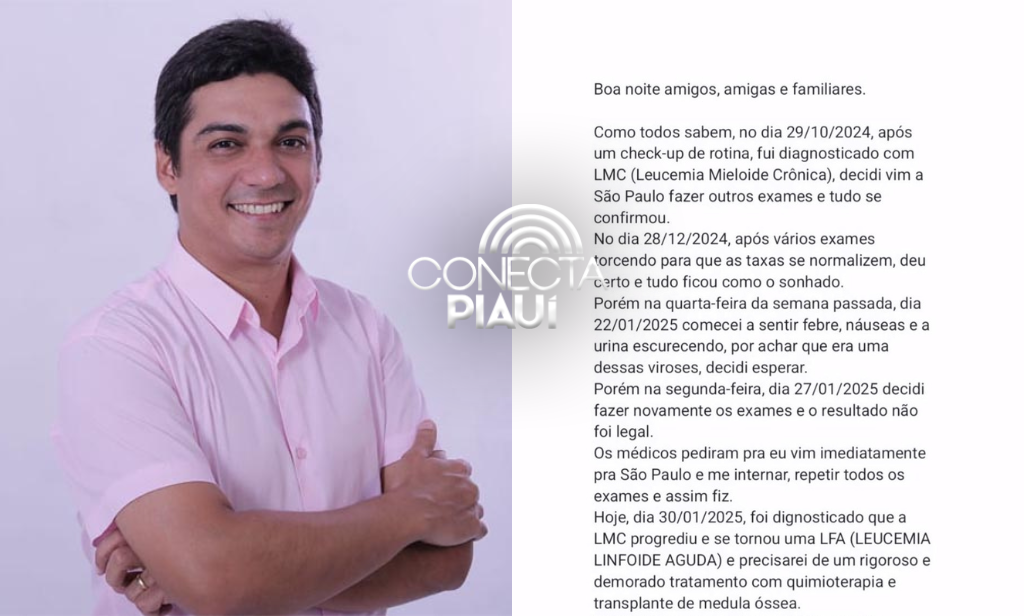 No ano passado, ele já havia recebido o primeiro diagnóstico e iniciado o tratamentoO prefeito de Angical, Bruno Neto (MDB), usou as redes sociais nesta quinta-feira (30/01) para compartilhar um momento difícil: a progressão de sua leucemia. No ano passado, ele já havia recebido o primeiro diagnóstico e iniciado o tratamento. Agora, vive uma nova etapa na luta contra a doença.