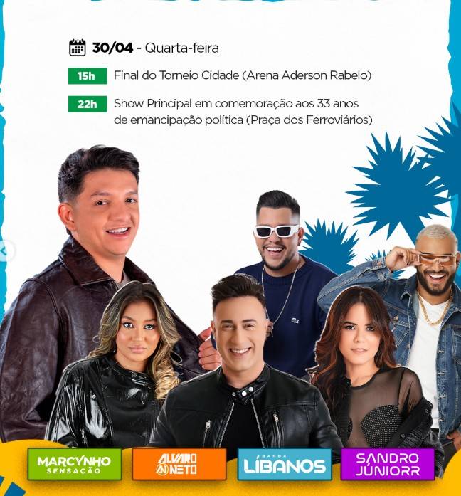 22h – Show Principal de Aniversário dos 33 anos de Emancipação Política (Praça dos Ferroviários)