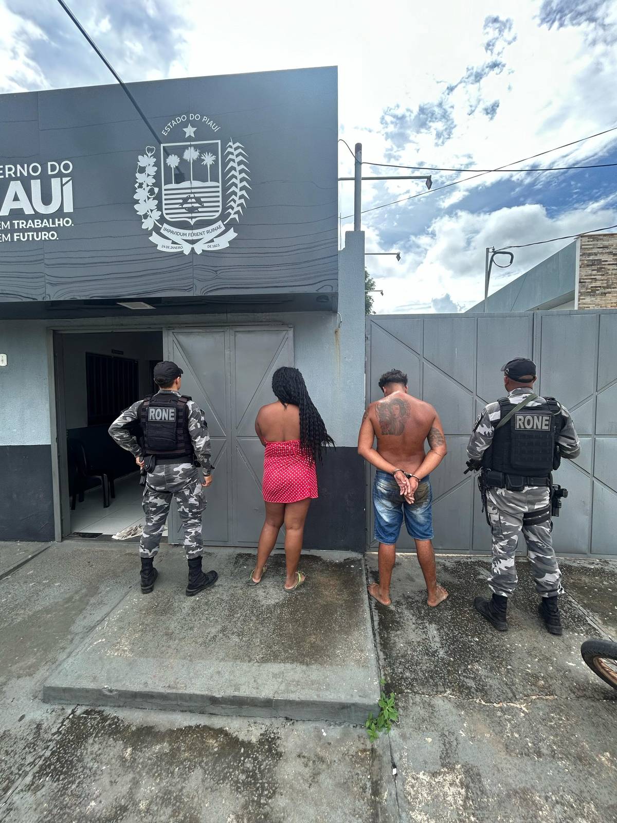 O casal foi conduzido à Delegacia de Água Branca (PI) suspeito de tráfico de drogas e porte ilegal de arma de fogo. A Polícia Militar segue em diligências para localizar o suspeito foragido.