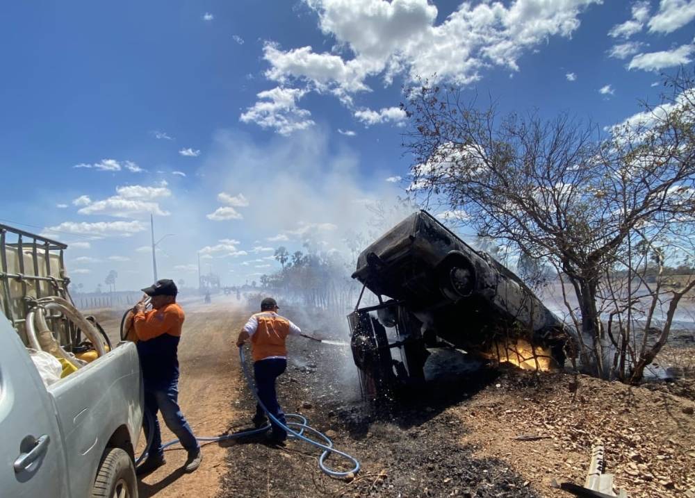 Imagens divulgadas nas redes sociais mostram o veículo sendo consumido pelas chamas logo após o capotamento.