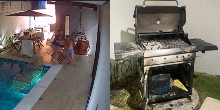 Câmeras de segurança instaladas na residência, mostram o momento exato em que a churrasqueira a gás explodiu durante um churrasco. Uma equipe especializada constatou que a válvula do botijão de gás superaqueceu, derretendo e se soltando para fora, causando a explosão.