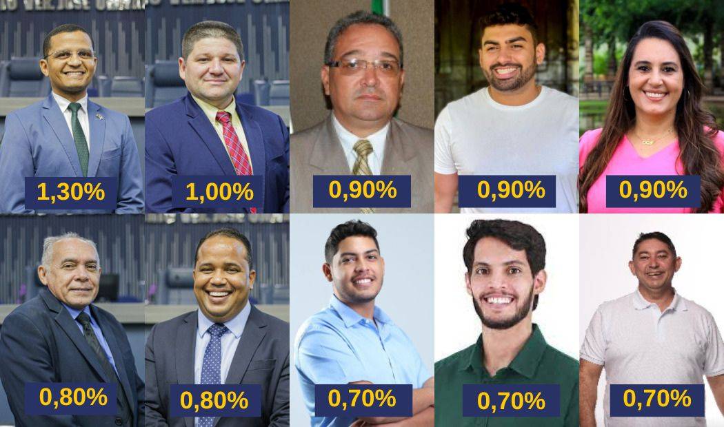 Ismael Silva lidera a disputa com 1,30% das intenções de voto, seguido por Zé Filho, que aparece em segundo lugar com 1,00%. Logo atrás, Major Paulo Roberto, Draga Alana e Ana Fidelis registraram 0,90%. Zé Nito e Enzo Samuel estão empatados com 0,80%. Completando o top 10, estão Samuel Alencar, Roncalli Filho e Carpejanne Gomes, todos com 0,70%.
