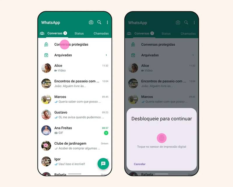 As conversas nessa pasta só poderão ser acessadas mediante a digitação de senha ou o uso de biometria, como impressão digital ou reconhecimento facial, já cadastrados no dispositivo. Além disso, a função também ocultará automaticamente o conteúdo dessas conversas nas notificações, afirmou a empresa.